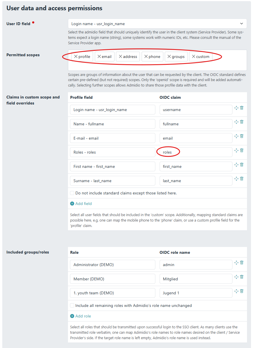 Admidio can be configured to send any profile field as an OpenID claim in the “custom” scope in the login response.