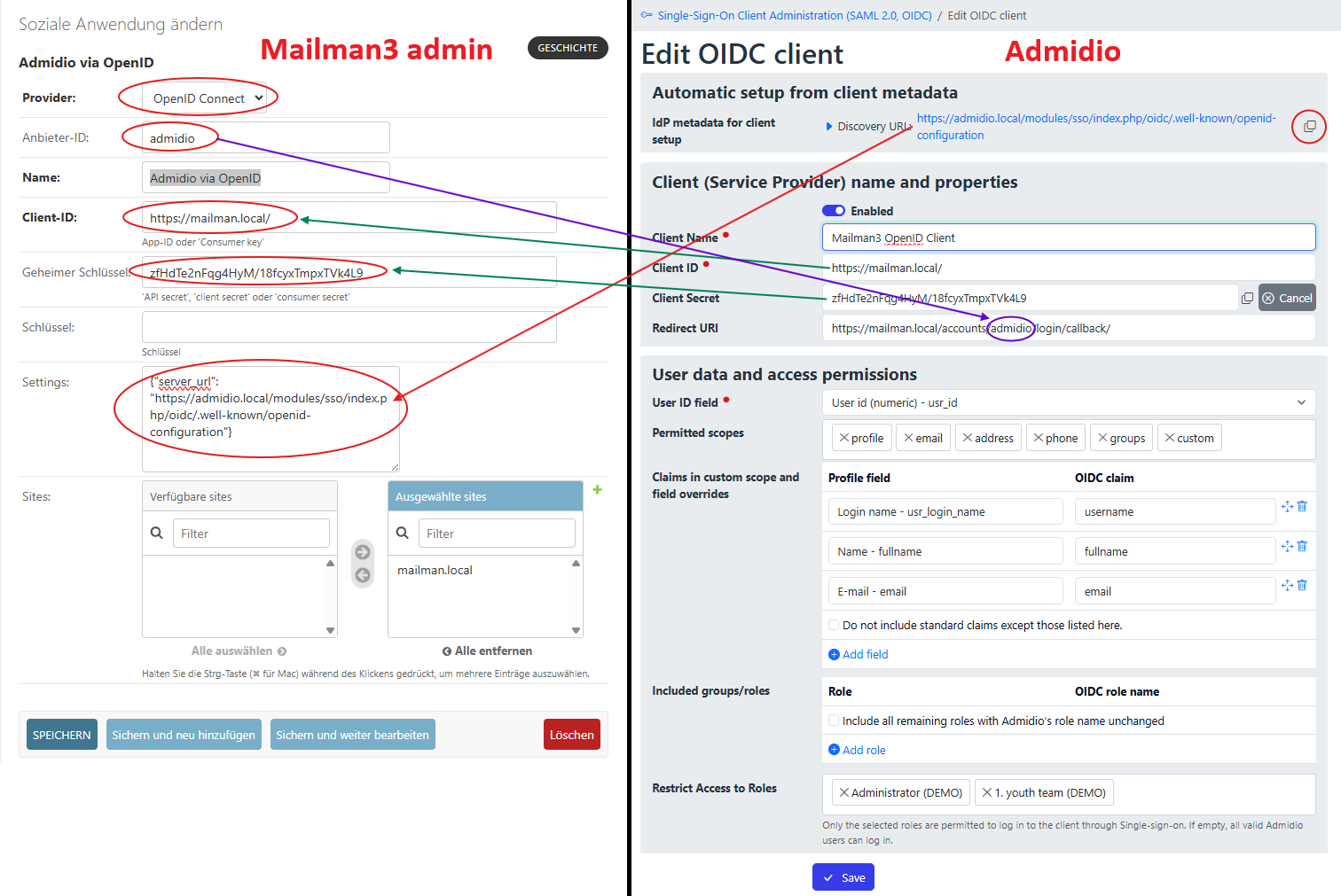 The settings in Mailman3's and Admidio's OpenID setup need to match. Most of the settings can be copied over from Admidio to Mailman3 or vice versa: