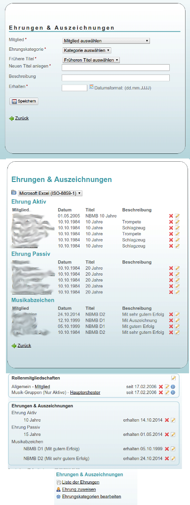 Die Ehrungen werden jeweils auf der Mitgliederseite unten aufgeführt sowie gesammelt auf einer extra Seite mit der Möglichkeit zum Export (csv,xls) dargestellt.