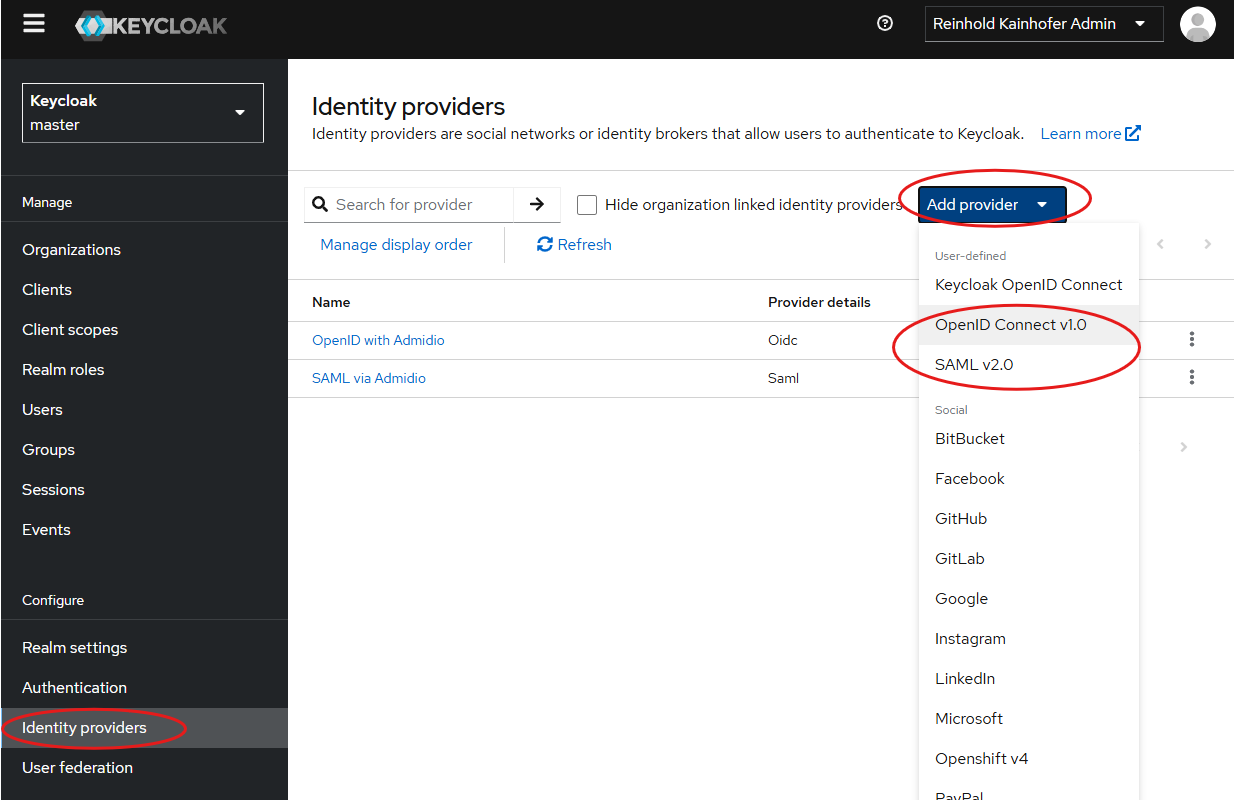 To add Admidio as an Identity Provider to log into Keycloak, go to your desired realm, choose “Identity Providers” on the left and add a new “SAML v2.0” Provider.