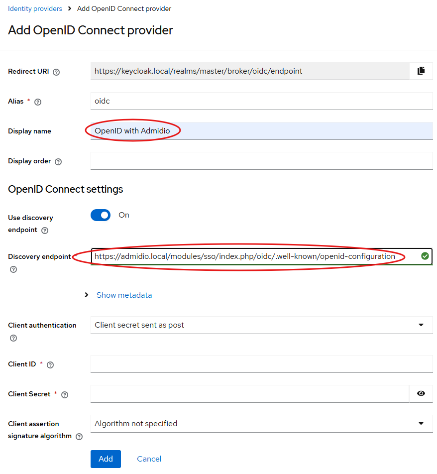 Keycloak supports auto-configuration, so copy the OpenID Metadata URL from Admidio's preferences and paste it into the “Discovery Endpoint” field. Keycloak will load the OpenID Provider configuration from Admidio and populate all fields.