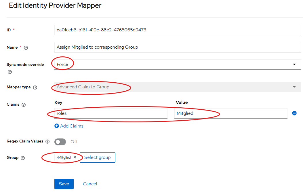 - Optionally select (both in Admidio and the RP) which profile fields should be mapped to OpenID claims (attributes) and sent to the client, and configure which group memberships should be transmitted and how they correspond to groups/roles in Keycloak.