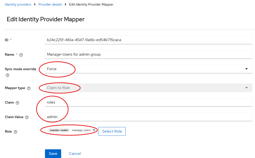 Go to the “Mappers” tab of the OpenID provider in Keycloak and add new mappers of type “Attribute Importer”. It is a good idea to choose “Force”, which will always update the keycloak user with the value from Admidio on every login. The “Claim” is the OpenID claim provided by Admidio, while the “User Attribute Name” is Keycloak's profile field name.