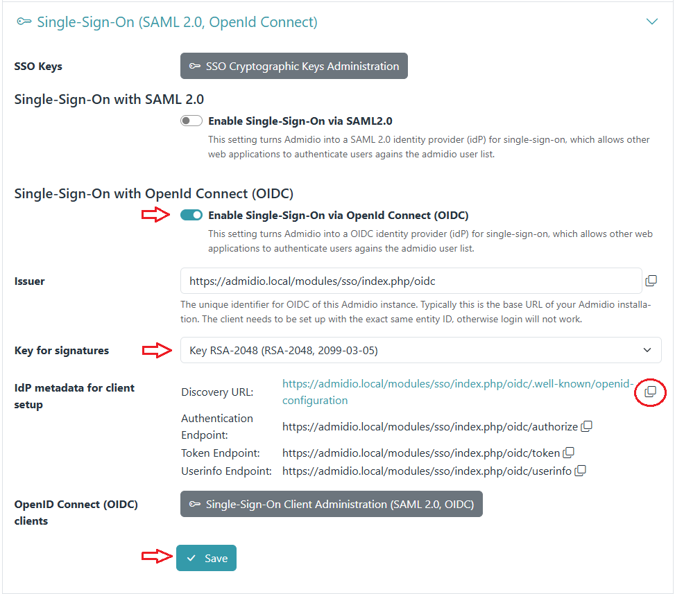 Basically, one (1) needs to create a cryptographic key to sign message and choose a unique EntityID. The page https://admidio.local/adm_program/modules/preferences.php?panel=sso also provides the link to the metadata xml, and the individual settings in case a client does not support auto-configuration via metadata.