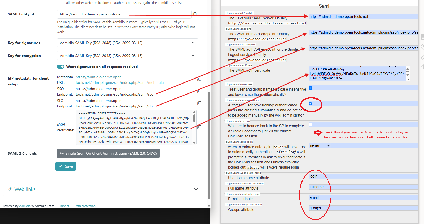 $conf['authtype'] = 'saml'; $conf['superuser'] = '@admin'; $conf['plugin']['saml']['idPEntityID'] = 'https://admidio.local'; $conf['plugin']['saml']['endpoint'] = 'https://admidio.local/modules/sso/index.php/saml/sso'; $conf['plugin']['saml']['slo_endpoint'] = 'https://admidio.local/modules/sso/index.php/saml/slo'; $conf['plugin']['saml']['certificate'] = 'MIIEF.........vlhuSLY'; $conf['plugin']['saml']['use_slo'] = 1;