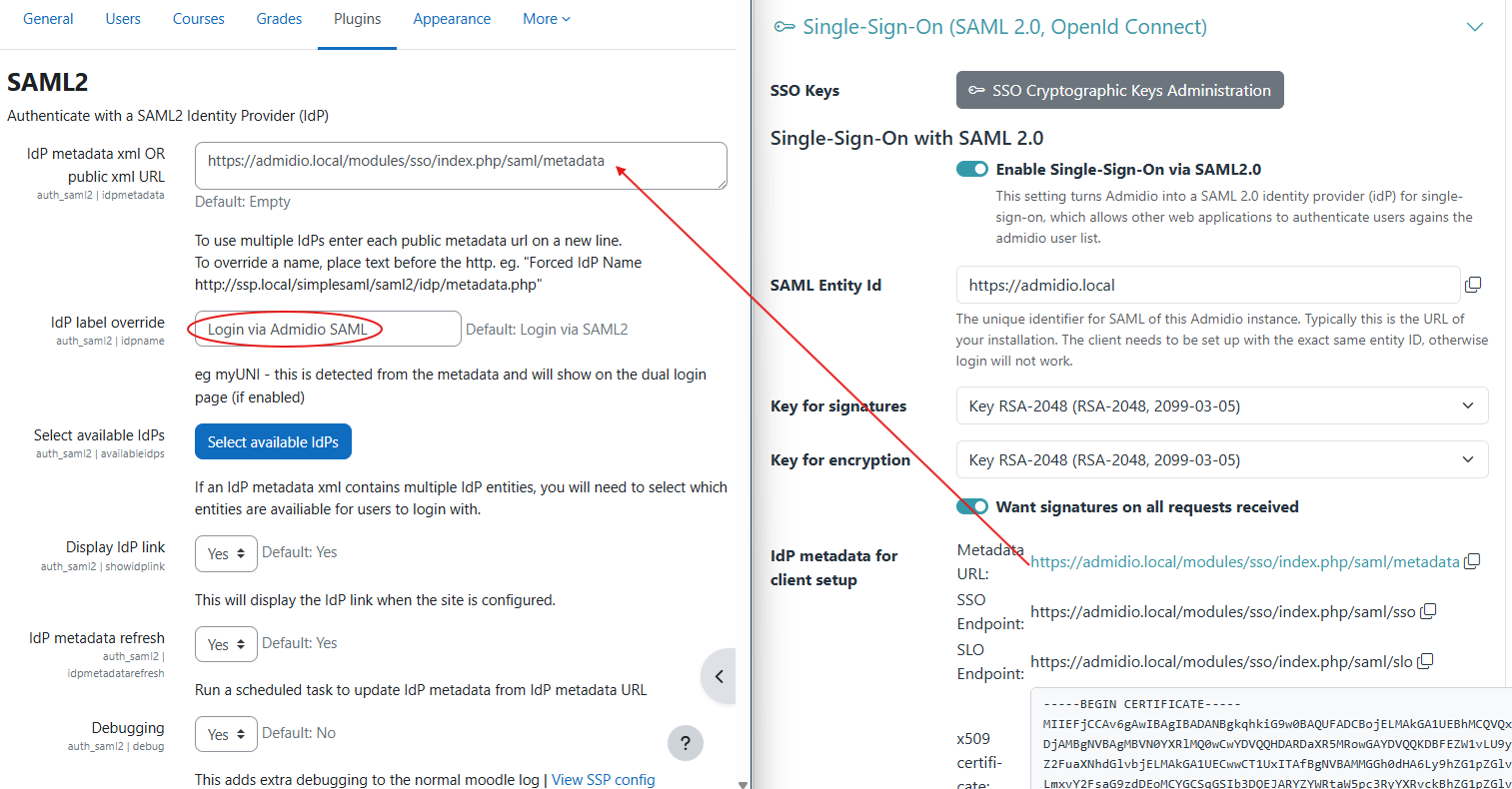 • The plugin supports auto-loading of Admidio's IdP settings. In particular, one only needs to copy the Metadata URL from Admidio to Moodle's plugin configuration, and the plugin will retrieve all endpoint URLs, the key and the signing/encryption settings automatically.