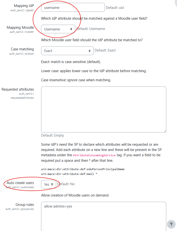 • The “Allow create” setting determines whether new users should be generated in Moodle when an unknown user successfully logs in through SAML.