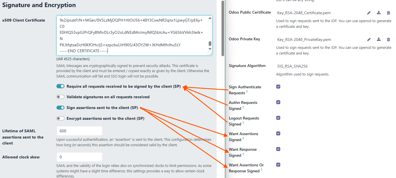 Once these basic SAML settings are done, I would recommend to set up the SP in Admidio, and do the remaining settings (transmitted fields, as well as signing/encryption requirements) in parallel in Odoo and Admidio.