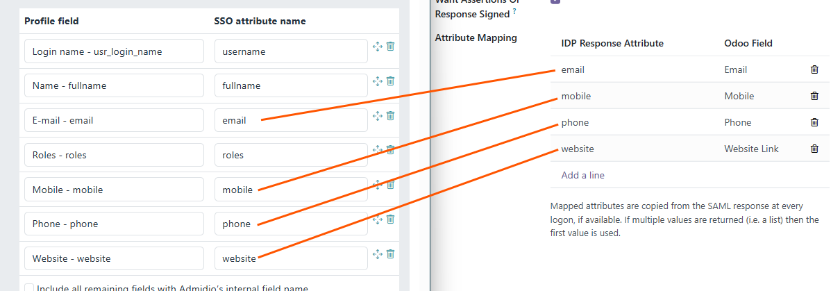 The plugin's configuration page also provides a mapping of SAML attributes to Odoo fields. Again, Admidio provides a similar mapping. Whatever information should be transferred from Admidio to Odoo should be configured. The actual SAML / IdP field name is not relevant, only the source Admidio field and the target Odoo field: