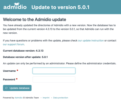 If the update page does not open automatically, you can access it directly via the following URL: ‘'www.example.org/admidio/install/update.php’'. - The following page will now appear, where you must confirm the update again. If the database has already been updated, this will be indicated accordingly. To prevent anyone else from performing the update, you must enter the login details of a webmaster. Then click on Update database and the database will be updated to the new version. Wait with further actions in the browser until the confirmation appears that the update has been successfully completed. This can take up to 4 minutes.