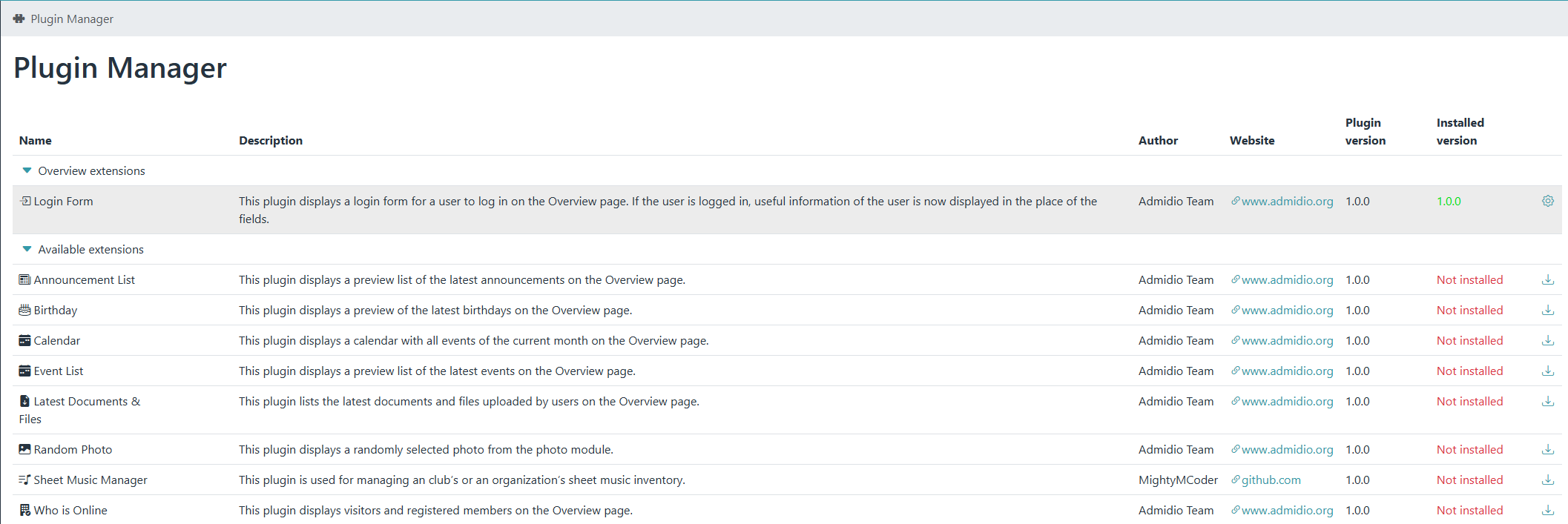 | “icon” | The icon displayed in the Admidio sidebar and on the Plugin Manager overview. | |